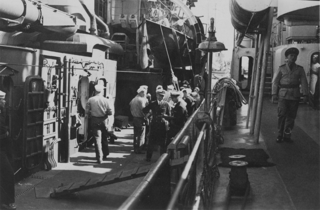 Ensign Miles & Ed Short (on USS Enright, right) await Commander
